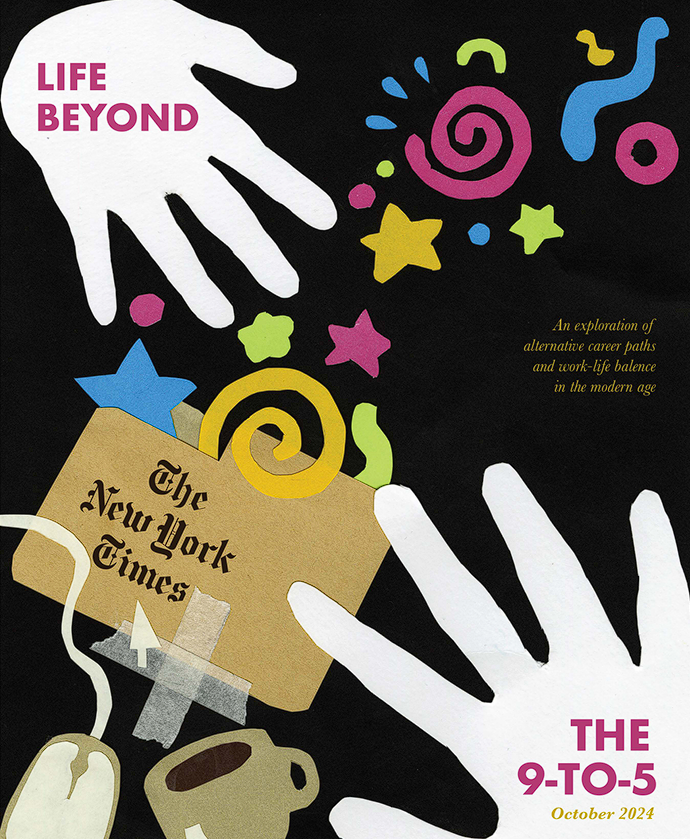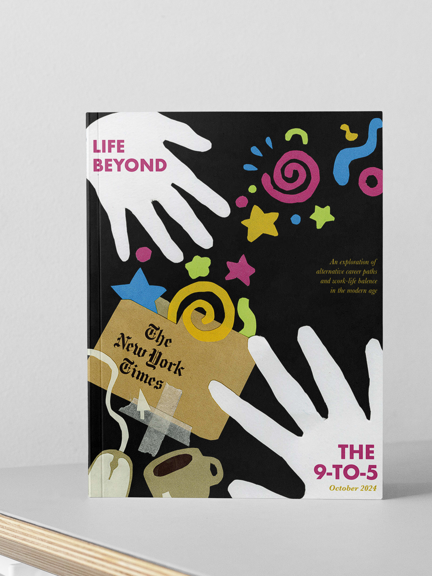 A mock New York Times cover I made titles "Life Beyond The 9-5". This project was made mainly with cut paper and typography added digitally. I wanted to implement child-like shapes and colors to represent the child-like wonder and imagination we tend to lose as we grow up and work "9-5" jobs. The shapes are popping out of a file folder to represent the alternative career paths that can be explored to have a better work-life balance.